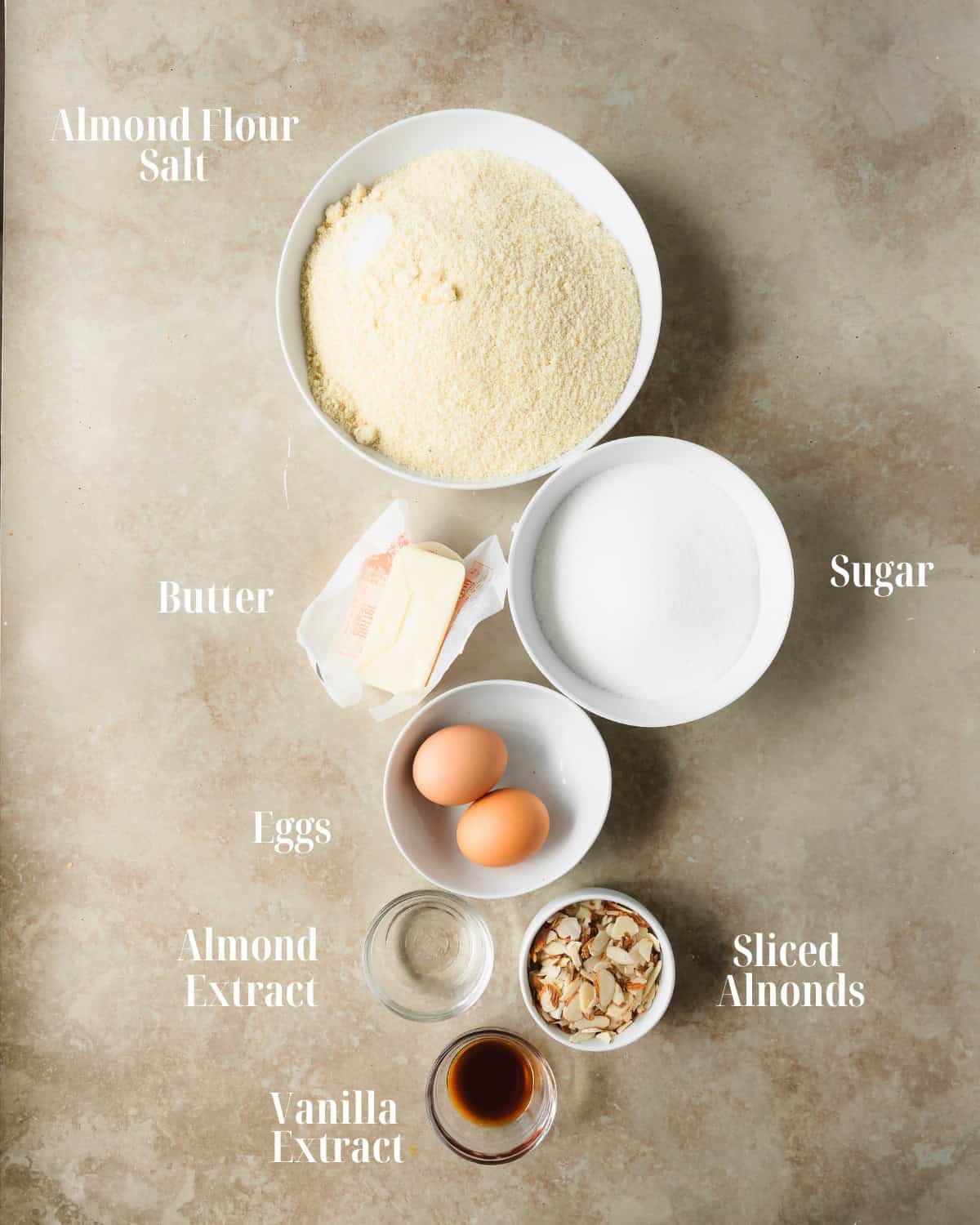 - Wet Ingredients: Gather unsalted butter, granulated sugar, eggs, almond extract, vanilla extract and sliced almonds for topping.