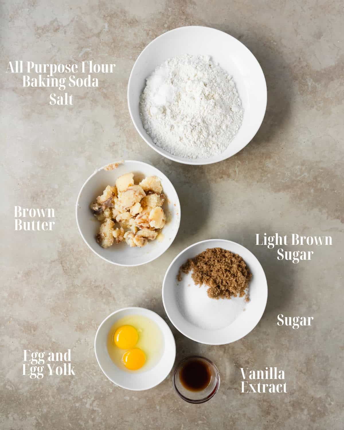 This brown butter cookies requires only a handful of simple ingredients to make and you probably already have them in your pantry and fridge. Here’s what you’ll need.