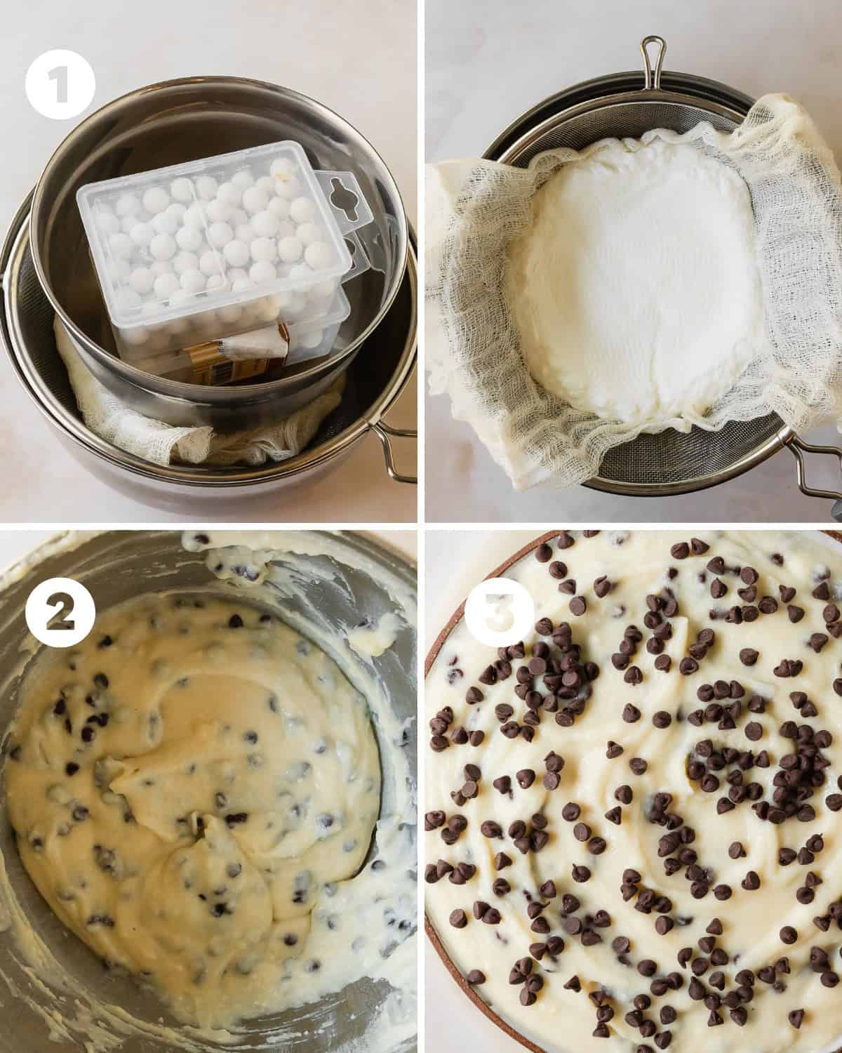 - For the smoothest dip, strain the ricotta. Place a cheese cloth or a 3 - 4 paper towels on the bottom of a mesh strainer. Scoop the cheese onto the cheese cloth or paper towels. Cover the cheese with excess cheese cloth or 1 - 2 paper towels. Add something like pie weights or a small bowl with rice on top of the cheese. This will gently release the excess water. Allow the cheese to strain for about 1 hour or up to overnight.
