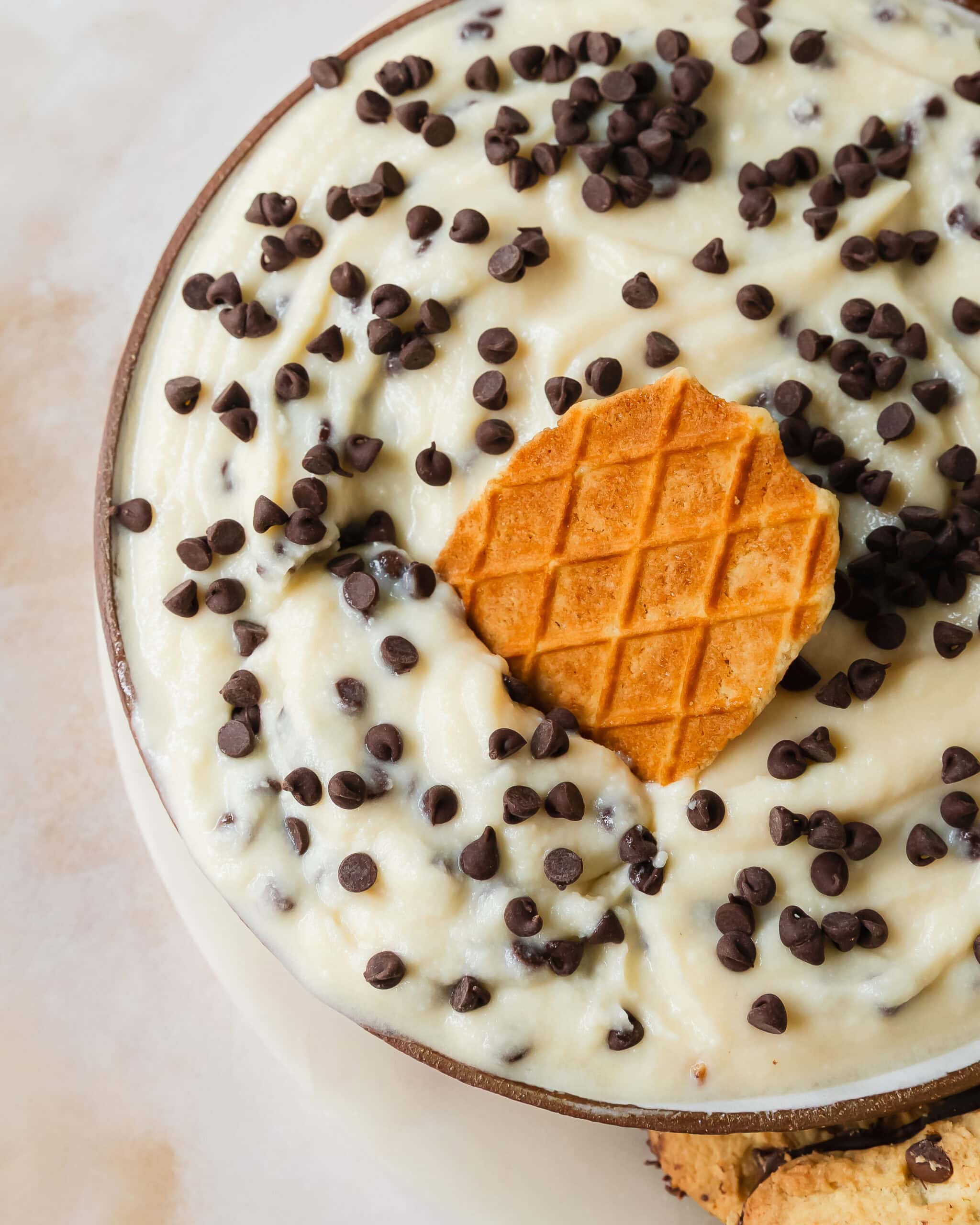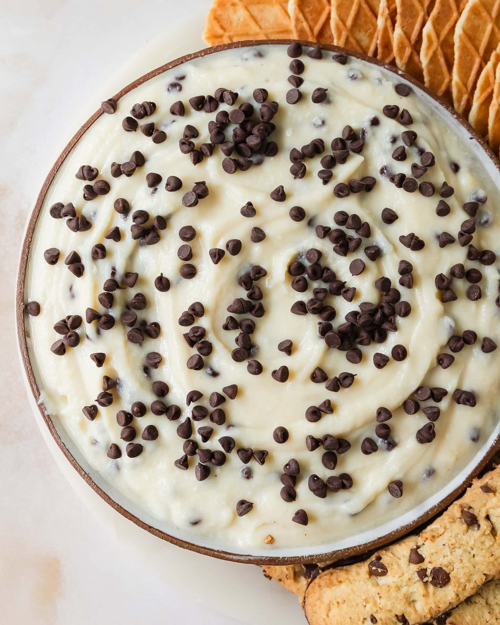 - Transfer the creamy cannoli filling dip into a serving bowl. Top with more chocolate chips if you like. Cover the dip and chill in the fridge for 1 hour or up to overnight. Serve with fresh fruit such as apples, pears or strawberries or with sweet dippers such as pizzoli cookies, biscotti, broken cannoli shells or waffle cones.
