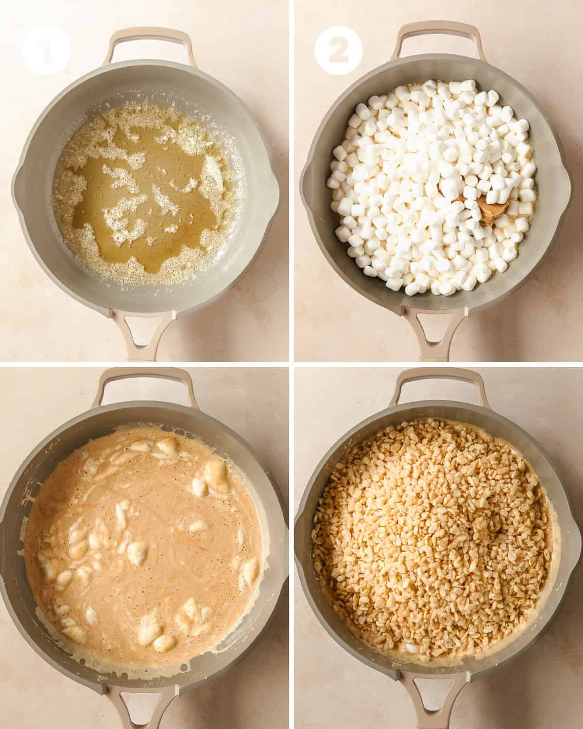 - As soon as the butter has browned, add most of the marshamllows and peanut butter. Reserve ¾ cup mini marshmallows for stirring into the treats. I suggest adding the peanut butter first and then the marshmallows. Stir continuously over low heat until the marshmallows are mostly melted and are well combined with the peanut butter and butter. Once the marshmallows are mostly melted remove the pot from the heat. Stir in the vanilla extract and salt.10 oz. mini marshmallows, divided, ½ cup (128 g) creamy peanut butter, 1 teaspoon vanilla extract , ¼ teaspoon salt
