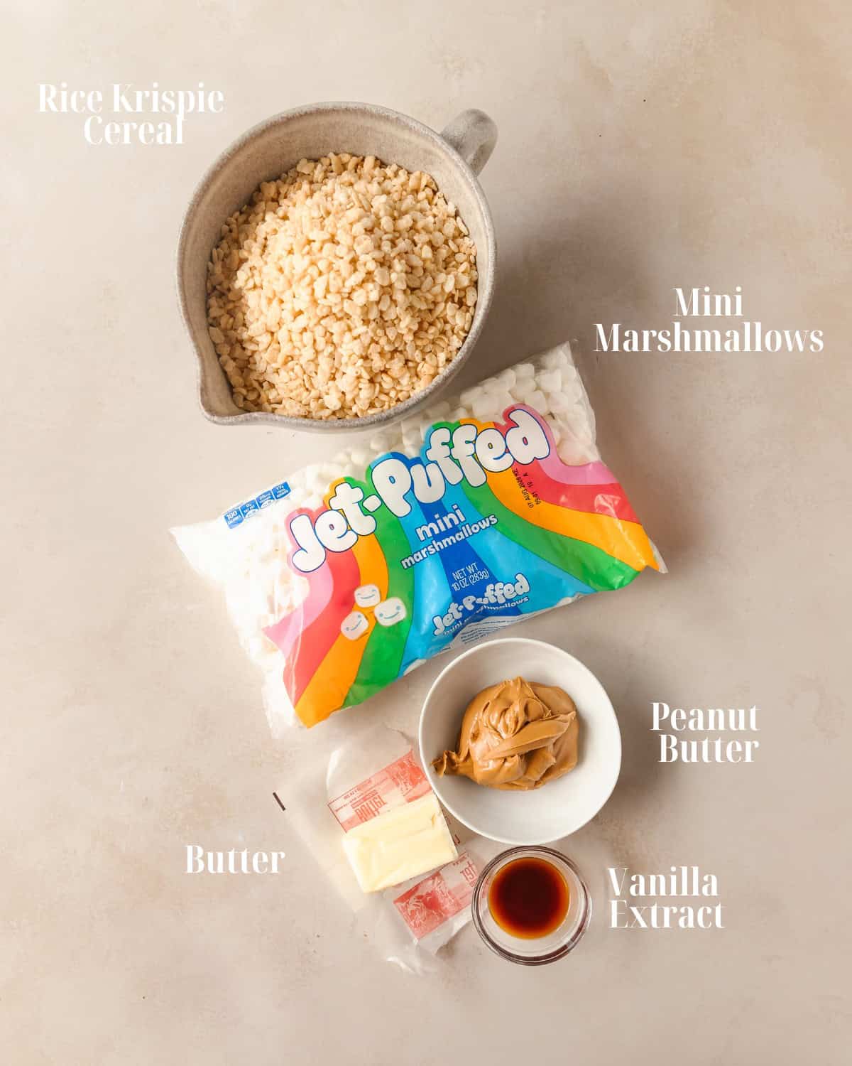 - Mini Marshmallows: This recipe for peanut butter treats uses (1) 10 oz. bag of mini marshmallows. Feel free to use regular marshmallows if needed, but mini ones are recommended for the best pb treats.