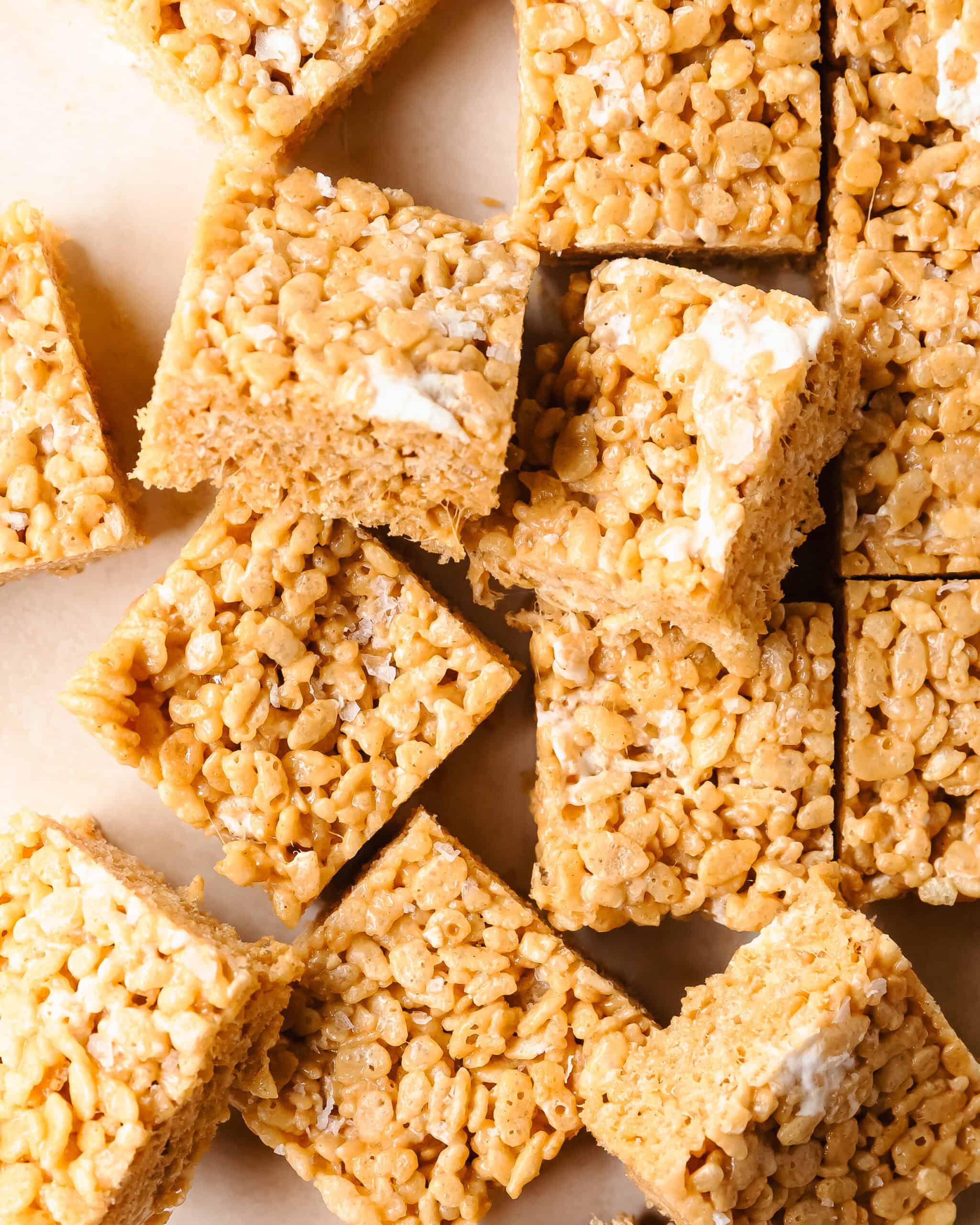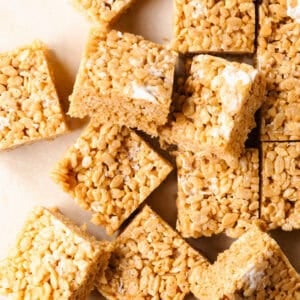 I have several marshmallow treat recipes on the blog. My personal favorites at the moment are my Brown Butter Rice Krispie Treats, Maple Tahini Rice Krispie Treats, Chocolate Covered Rice Krispie Treats and Chocolate Rice Krispie Treats. These peanut butter rice crispy treats are another fun twist on the nostalgic no bake marshmallow bars you know and love.