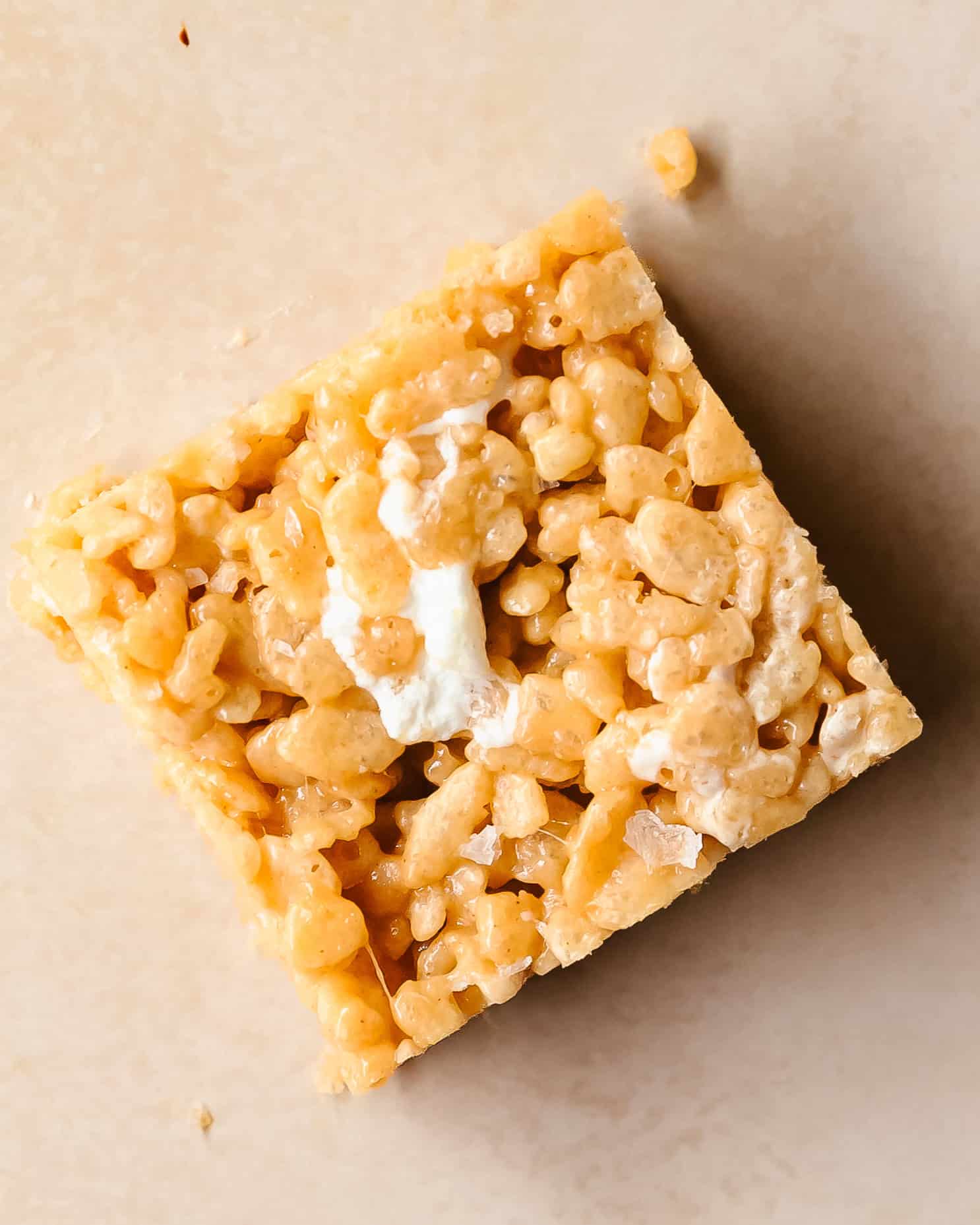 These nutty marshmallow treat bars are gooiest and are best enjoyed the day they are made. However, if they are made in advance (no more than a day before), fully cover the pan with plastic wrap to prevent air from drying out the treats.