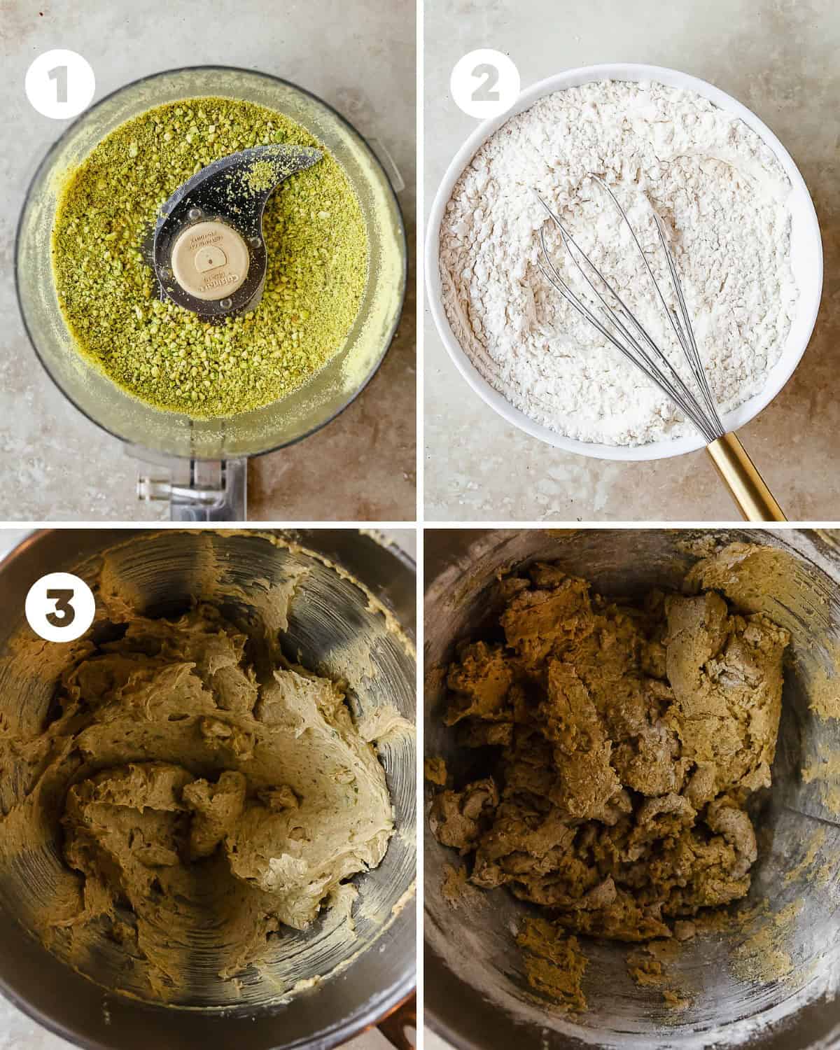 - Slice the cold butter into tablespoon sized slices. Heat the cold butter in the microwave for 20 seconds. The butter should still be solid, but will have softened sides. Add the butter to a large mixing bowl fitted with a paddle attachment. Add light brown sugar, sugar and the ground pistachios to the mixing bowl. Cream together the butter with the sugars and ground pistachios on medium speed for 3 minutes or until well combined.½ cup (113 g) unsalted butter, cubed, ¾ cup (150 g) light brown sugar, ¼ cup (50 g) granulated sugar