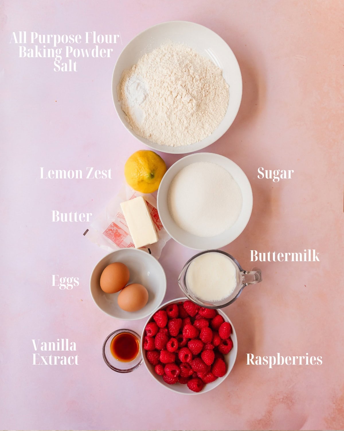 - Vanilla Extract and Lemon Zest: The scent of vanilla gives a warm cozy background flavor to this cake. While the lemon brings a fresh tartness that beautifully complements the raspberries. Use vanilla bean paste or any other citrus as alternatives.