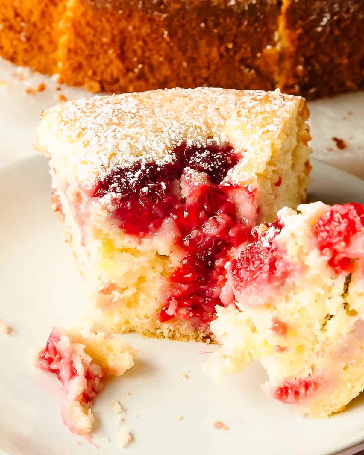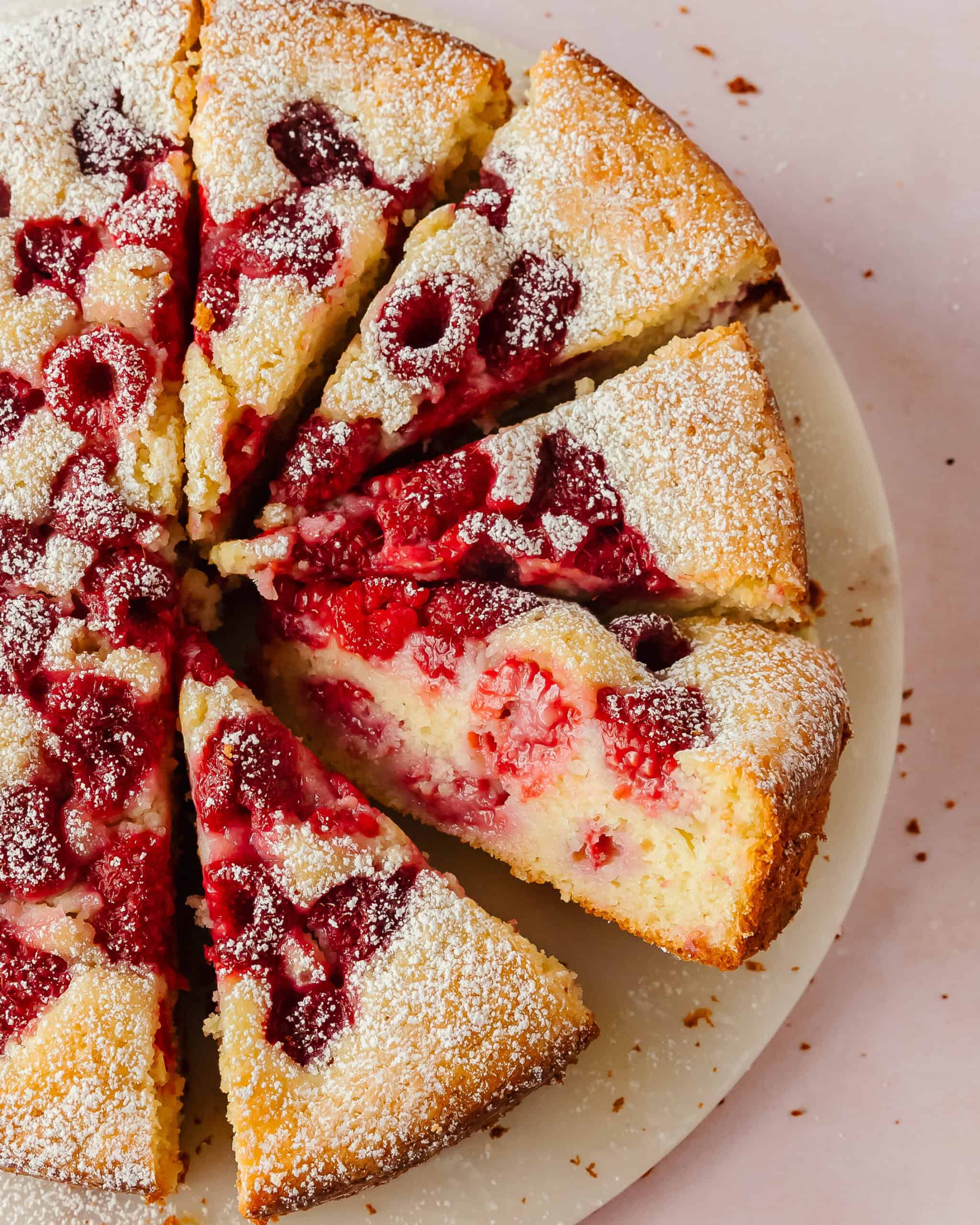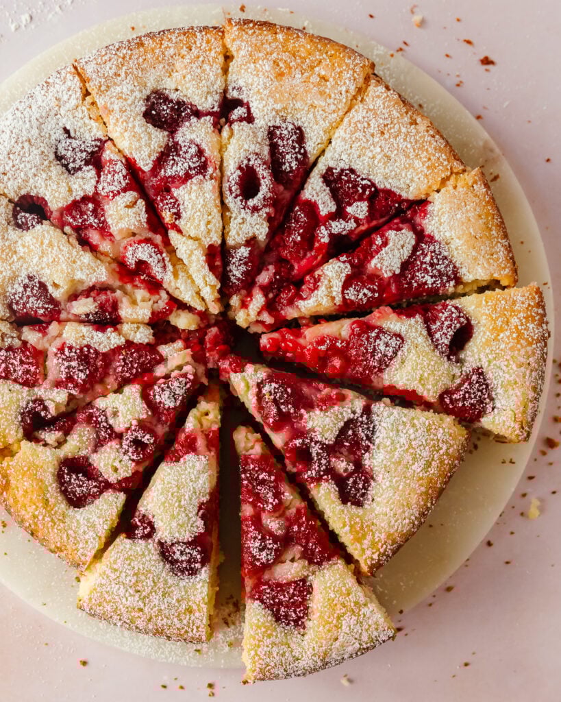 - If you prefer to have only raspberries on the top of the cake, skip folding the (1 cup) raspberries into the cake batter and use 2 cups on the top as written in the recipe. Alternatively, fold 2 cups of raspberries (tossed in 1 tablespoon flour) into the cake batter