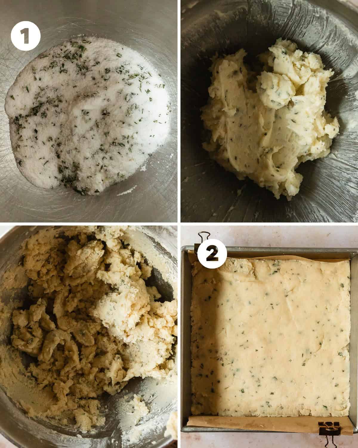 - Preheat the oven to 350 F (177 C) for 20 - 30 minutes before baking the shortbread. Line a 8 x8 (20 cm) aluminum pan with parchment paper along the bottom and two sides. Leave a little bit of an overhang to help lift the cookie bars out of the pan after baking. Using a stand mixer fitted with paddle attachment or electric hand mixer with beaters, cream the sugar and fresh rosemary for 1 minute on low to help release the rosemary oils into the sugar. If you would like to add 1-2 tablespoons of lemon or orange zest, add it at the same time as the rosemary. After 1 minute, add the room temperature butter, honey and salt. Cream the butter, sugar, honey, rosemary and salt together on medium speed until well combined. This takes about 2 -3 minutes on medium speed. Add the flour ½ cup at a time, mixing until most of the flour is combined before adding the next ½ cup. Press any excess flour into the dough with a silicone spoon or with clean hands.