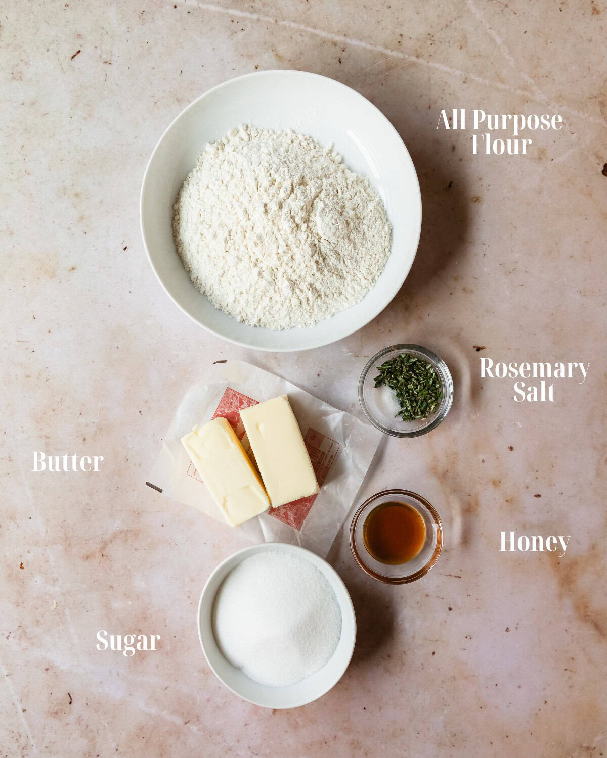 Gather sugar, fresh rosemary, salt, butter, honey and flour.