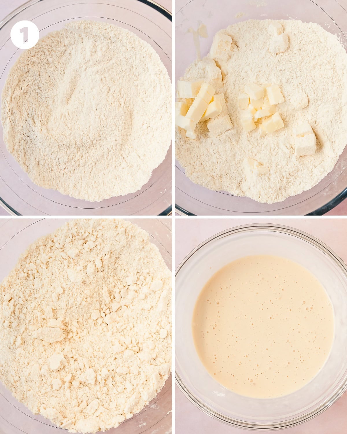 - Whisk the flour, sugar, baking powder and salt together. Grate or toss very small cubes of cold butter into the flour. When all the butter has been added in, use a pastry cutter or your fingers to work the butter into the flour mixture until the butter is fully incorporated and the mixture resembles coarse sand with some larger pieces.