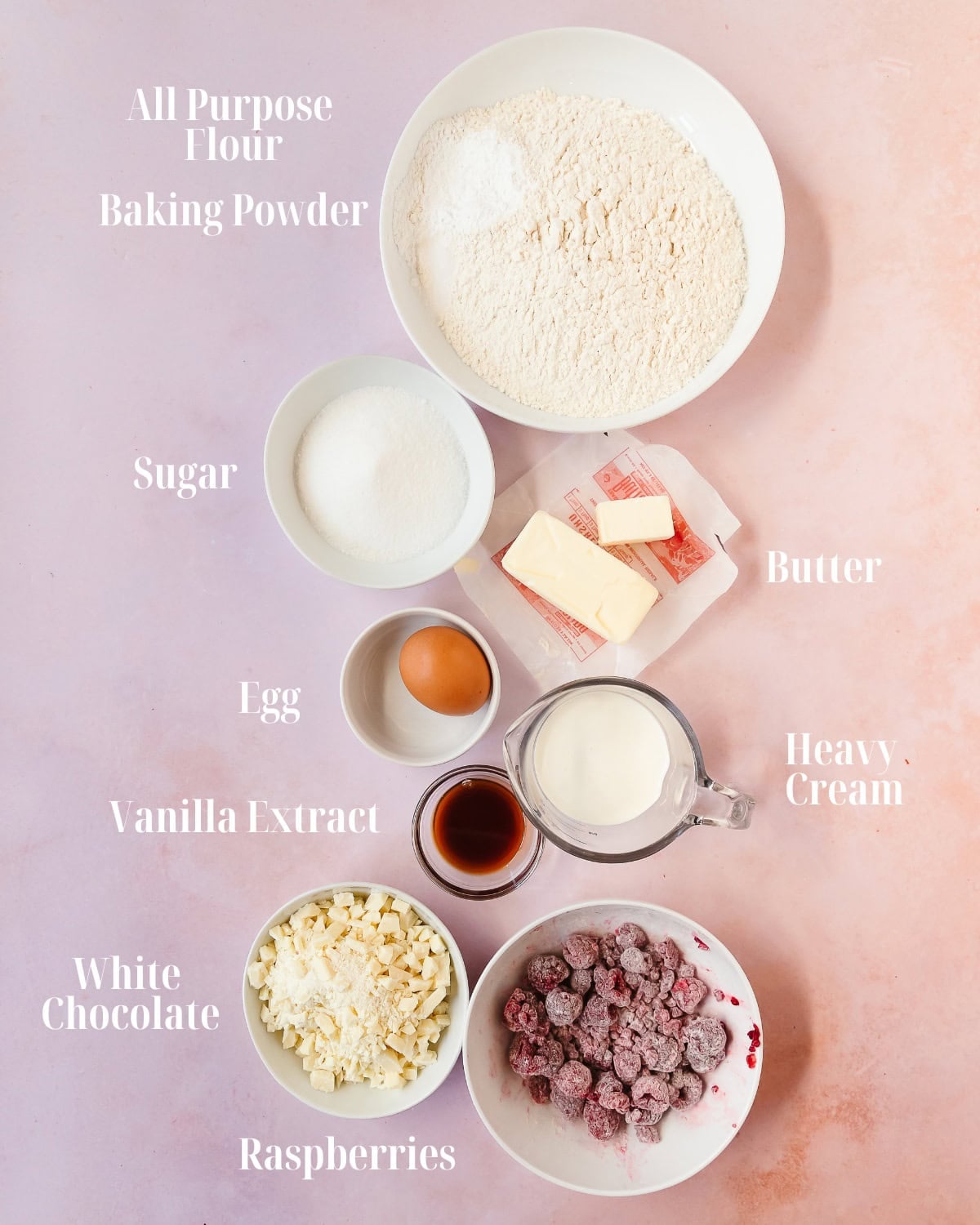 This recipe for white chocolate raspberry scones requires only a handful of simple ingredients to make and you probably already have them in your pantry and fridge. Here’s what you’ll need.